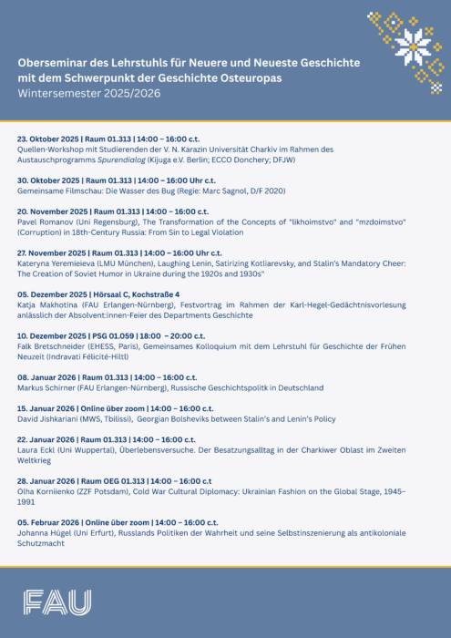 Wir laden alle Interessierten herzlich zum Oberseminar des Lehrstuhls für Neuere und Neueste Geschichte mit dem Schwerpunkt der Geschichte Osteuropas ein. Das Seminar findet – sofern nicht anders angegeben – jeweils donnerstags von 14:00 bis 16:00 Uhr (c.t.) im Seminarraum des Lehrstuhls (Bismarckstraße 12, 91054 Erlangen, 1. Stock) statt.